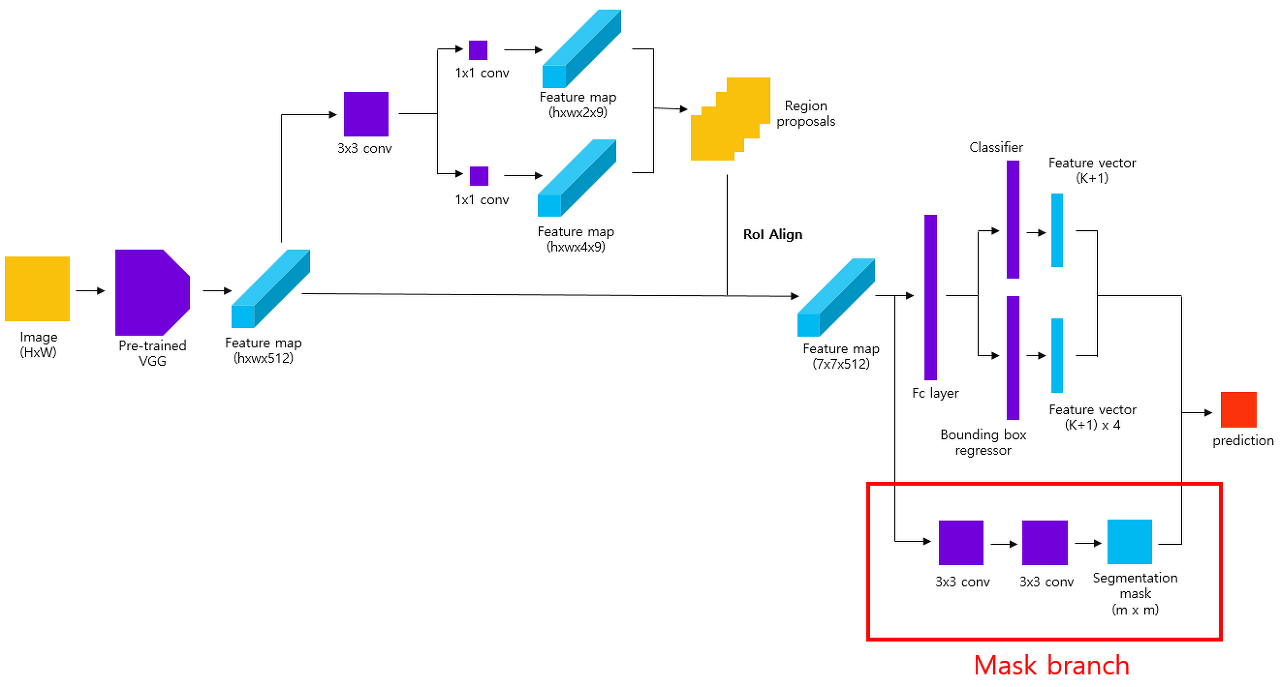 - Faster R-CNN의 RPN에서 얻은 RoI(Region of Interest)에 대하여 객체의 class를 예측하는 classification branch + bbox regression을 수행하는 bbox regression branch와 평행으로 segmentation mask를 예측하는 mask branch