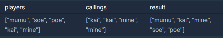 선수들의 이름이 1등부터 현재 등수 순서대로 담긴 문자열 배열 players와 해설진이 부른 이름을 담은 문자열 배열 callings가 매개변수로 주어질 때, 경주가 끝났을 때 선수들의 이름을 1등부터 등수 순서대로 배열에 담아 return 하는 solution 함수를 완성해주세요.