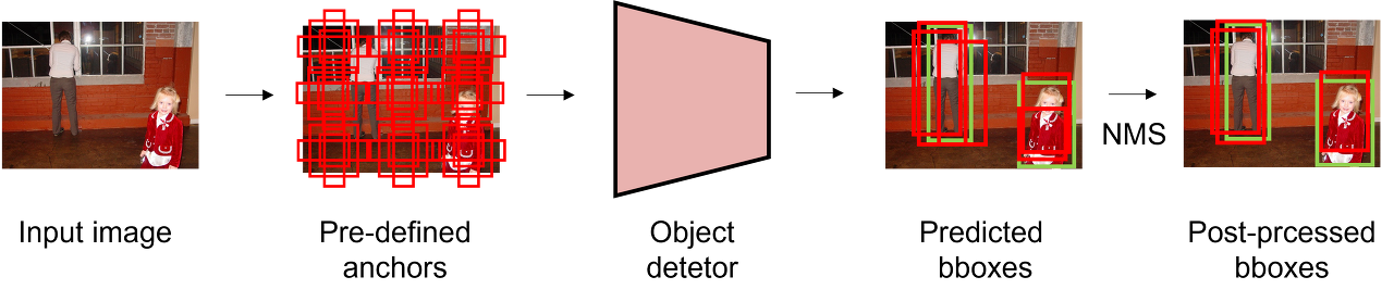 - 하나의 ground truth를 예측하는 다수의 bounding box가 존재하기 때문에, 이러한 near-duplicate한 예측(중복), 불필요한 예측을 제거하기 위해 NMS(Non Maximum Suppression)과 같은 후처리 과정이 반드시 필요