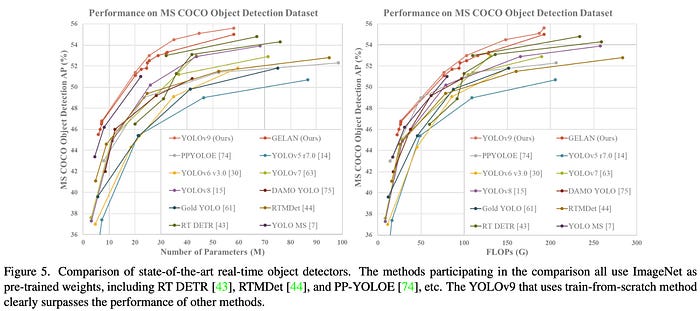 - 깊이별 Convolution이나 ImageNet 사전 훈련을 사용하는 모델과 비교할 때 YOLOv9는 뛰어난 매개변수 활용도와 계산 효율성을 보여줌