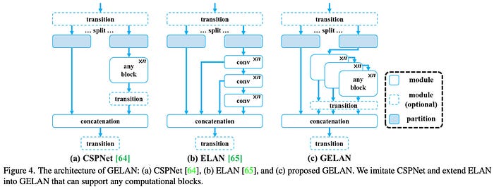 - GELAN은 전략적으로 아키텍처를 발전시켜 YOLOv9이 뛰어난 파라미터 활용도와 계산 효율성을 달성할 수 있게함.