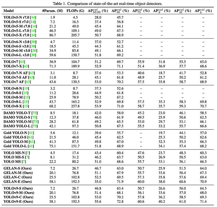 - YOLOv9는 다양한 모델 크기에서 기존 실시간 객체 감지기보다 성능이 뛰어나며 더 적은 매개변수와 감소된 계산 요구 사항으로 더 높은 정확도를 달성