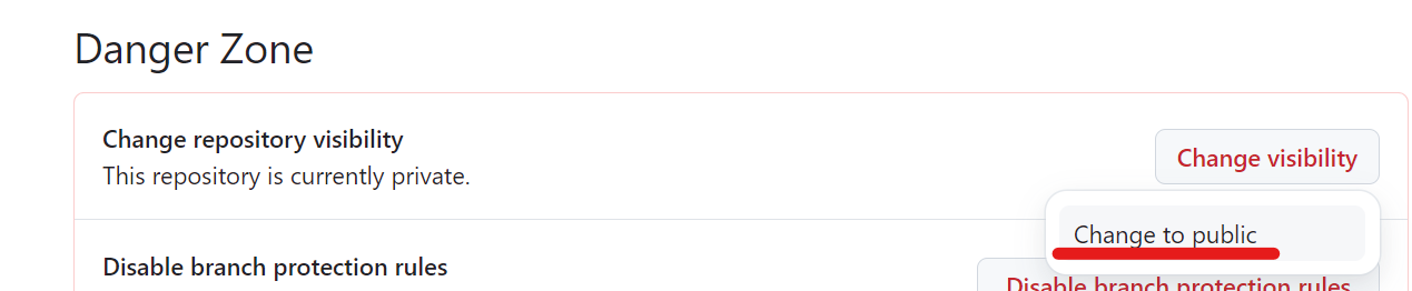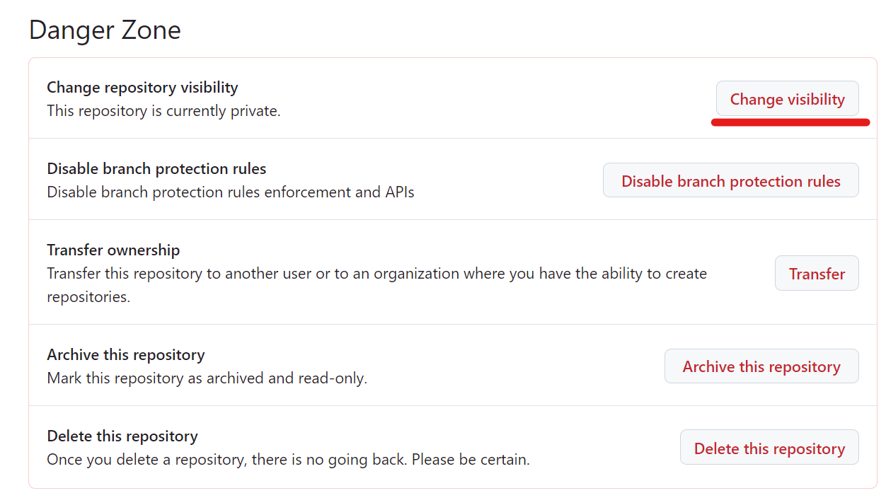 2. 스크롤 다운하여 "Danger Zone"에서 'Change visibility' 클릭