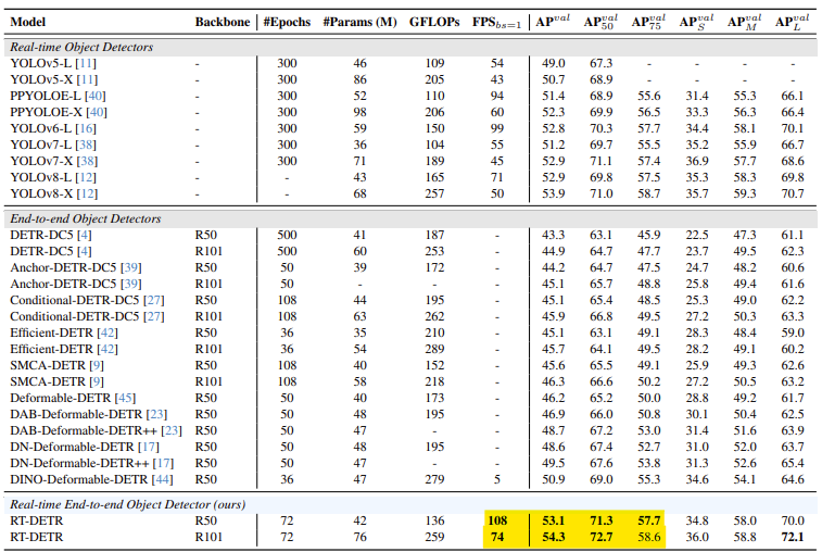 - 또한, RT-DETR-R101 모델은 54.3% AP와 74 FPS를 기록하며, 속도와 성능에서 최상의 성능을 달성했습니다.
