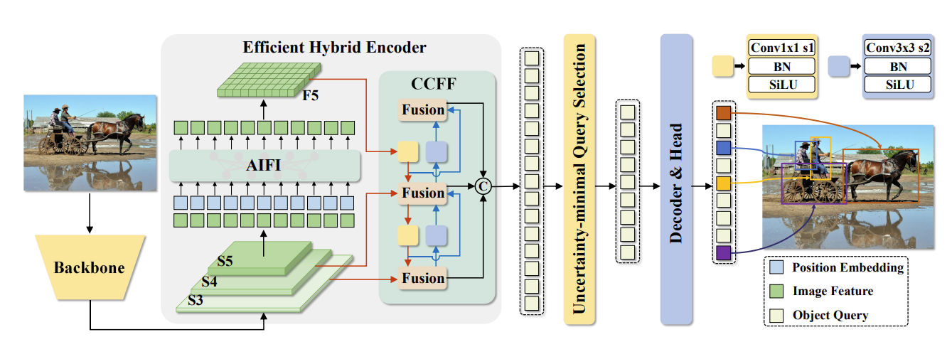 - RT-DETR은 Hybrid Encoder와 Uncertainty-minimal Query Selection 메커니즘을 사용하여 속도와 정확도를 모두 향상시킵니다.