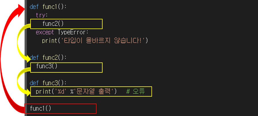 - 내용을 실행하다가 오류가 발생한 부분에서 except에 코딩된 내용을 실행함.