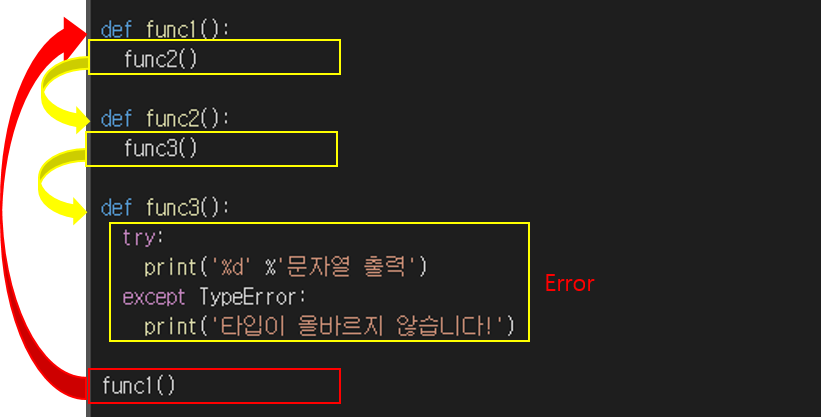 - except에 입력된 에러가 발생하지 않을 때 except문은 처리되지 않음