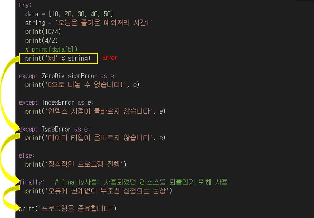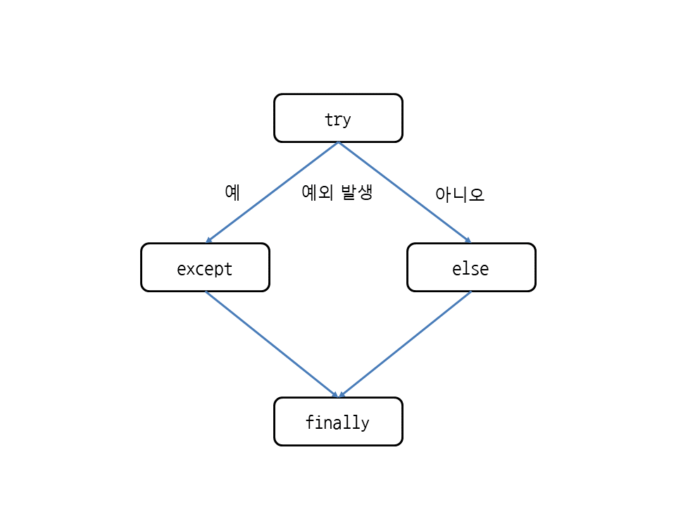 - 오류가 발생될 것으로 예상되는 문장을 try 블록에 코딩하고, try 블록에 코딩된 내용을 실행하다가 오류가 발생하면 더이상 try 블록의 내용을 실행하지 않고 해당 오류의 except 블록에 코딩된 내용을 실행