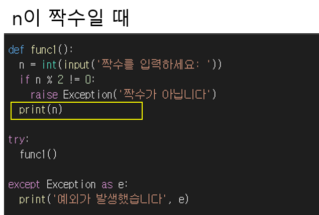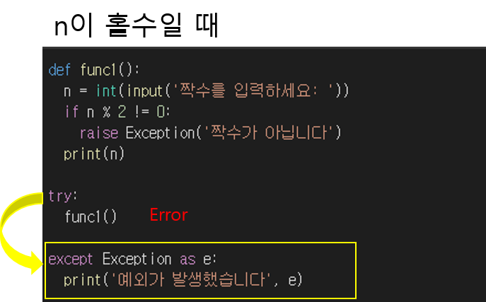 raise Exception('짝수가 아닙니다') # 예외를 발생시킴