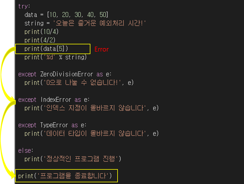 - 인덱스 에러가 발생하기 전까지는 실행되고 에러가 발생한 부분은 except에 작성된 내용이 실행된다.