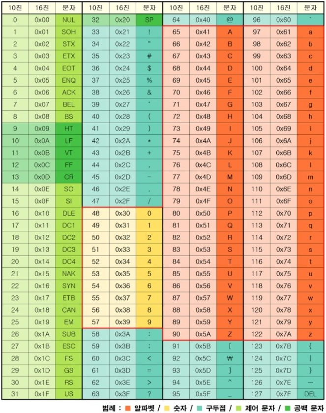 - 미국 ANSI에서 표준화한 정보교환용 7비트 부호체계