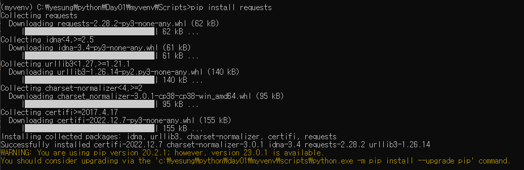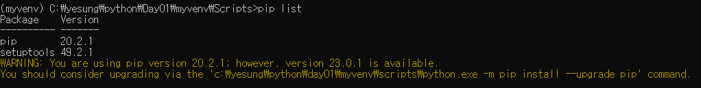 - 위 cmd 창에서 WARNING 문구는 pip의 새로운 버전으로 업그레이드 하라는 경고문이다.