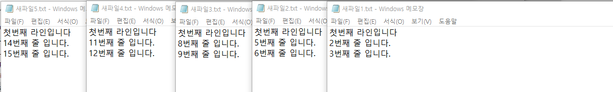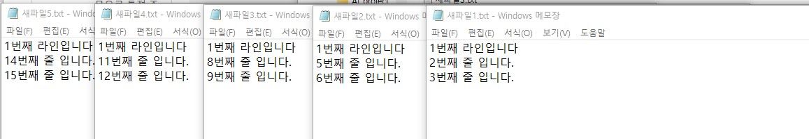 ✅ 각 파일에는 다음과 같이 3줄씩 '15번째 줄 입니다.' 까지 입력하고 저장했다.