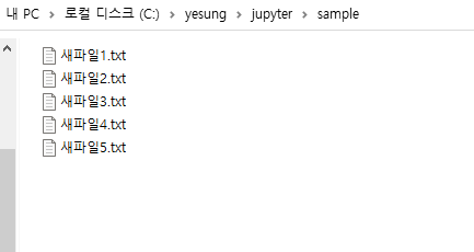✅현재 폴더에 하위폴더 'sample'을 만들고 안에 새파일1~5.txt 5개의 파일을 만들었다.