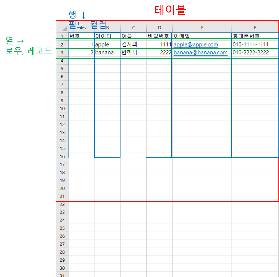 - 데이터 베이스를 테이블, 행, 열의 정보를 구조화하는 방식(엑셀의 시트와 비슷함)