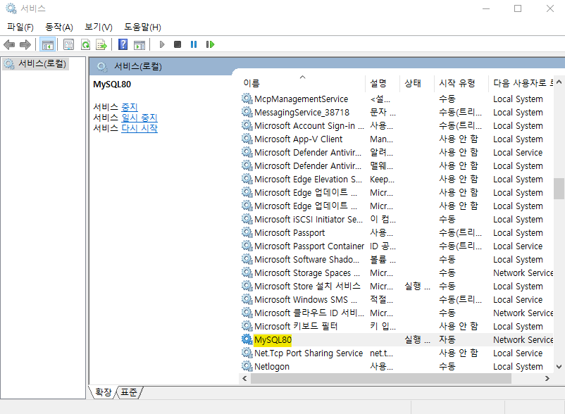 2) 서비스 창에서 'MySQL80' 실행중인지 확인
