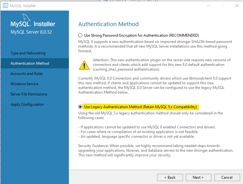 2) Authentication Method 설정시 Legacy Authentication Method를 선택하였다.