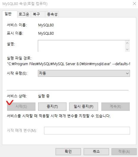 ※ 실행 안될 시에는 'MYSQL80' 더블클릭 후 중지 누르고 다시 시작을 누르면 된다.
