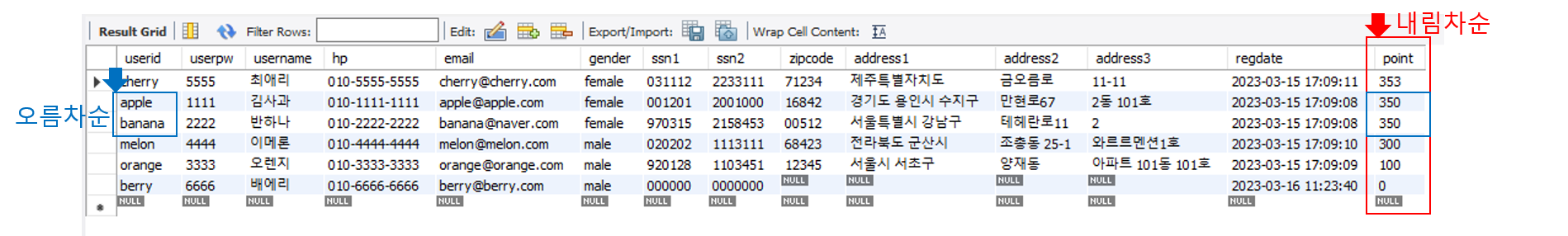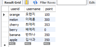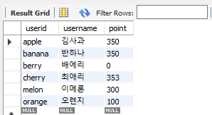 select userid, username, point from member order by userid ; # asc 생략가능