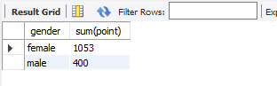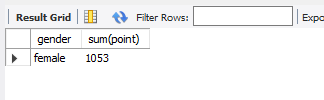 ✅ gender로 그룹하고 성별이 여자인 회원들의 성별과 point 총합 조회