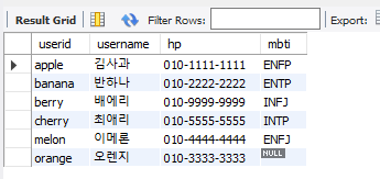 ✅ member의 userid, username, hp와 profile의 mbti를 출력하는 view(vw_memberprofile)를 만들어보자.