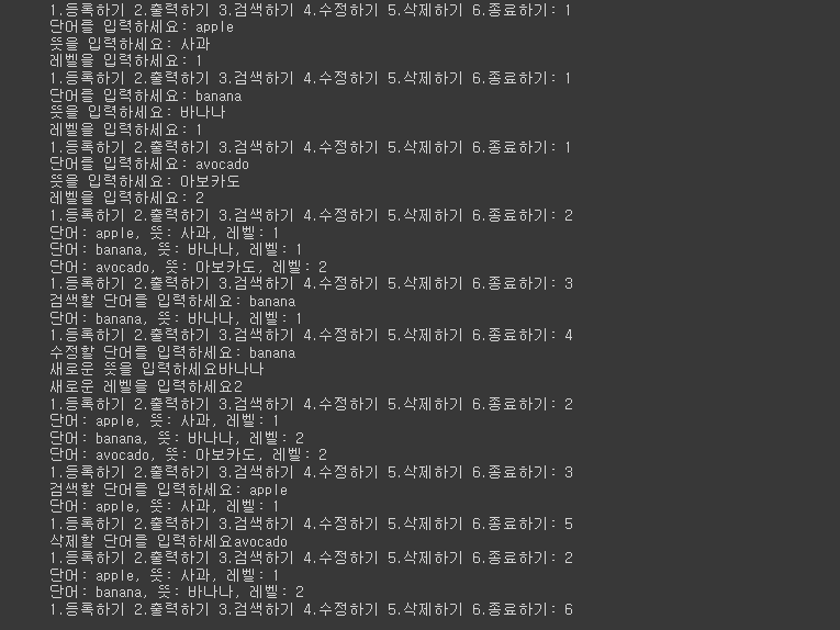 >>> 단어: apple, 뜻: 사과, 레벨: 1